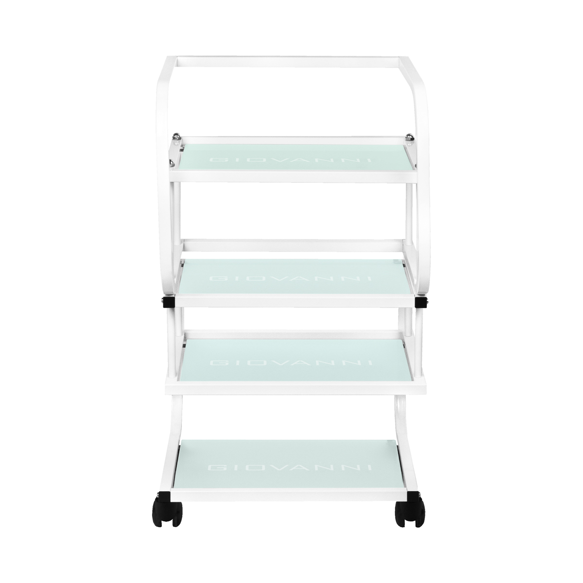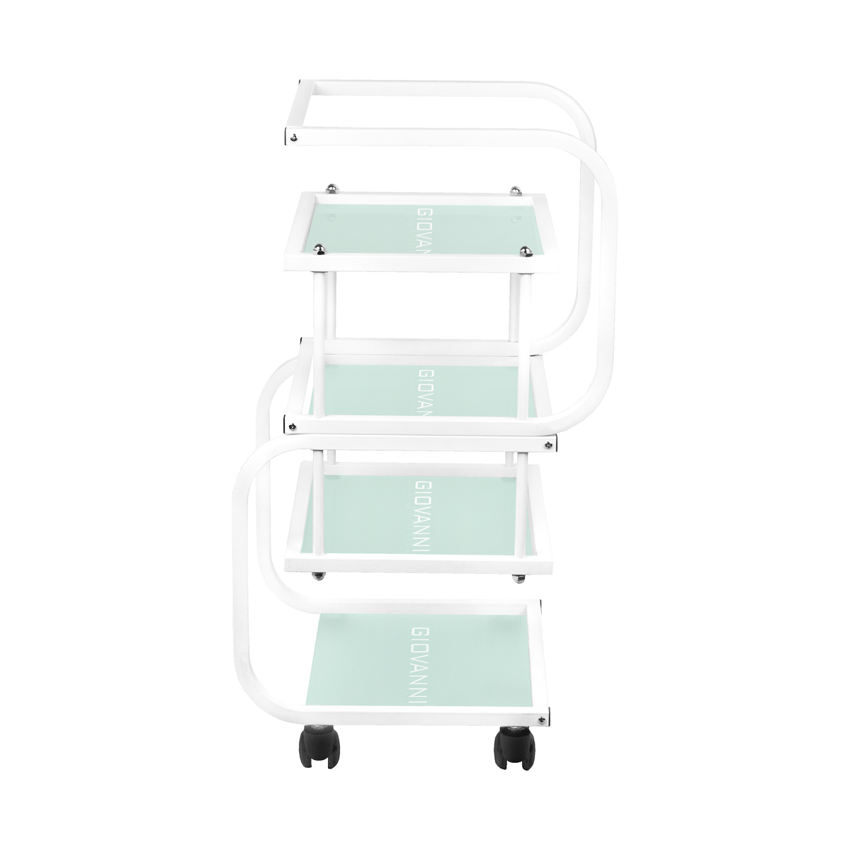 aesthetic table for a cosmetic device, made of metal and glass, with wheels. has four glass shelves.