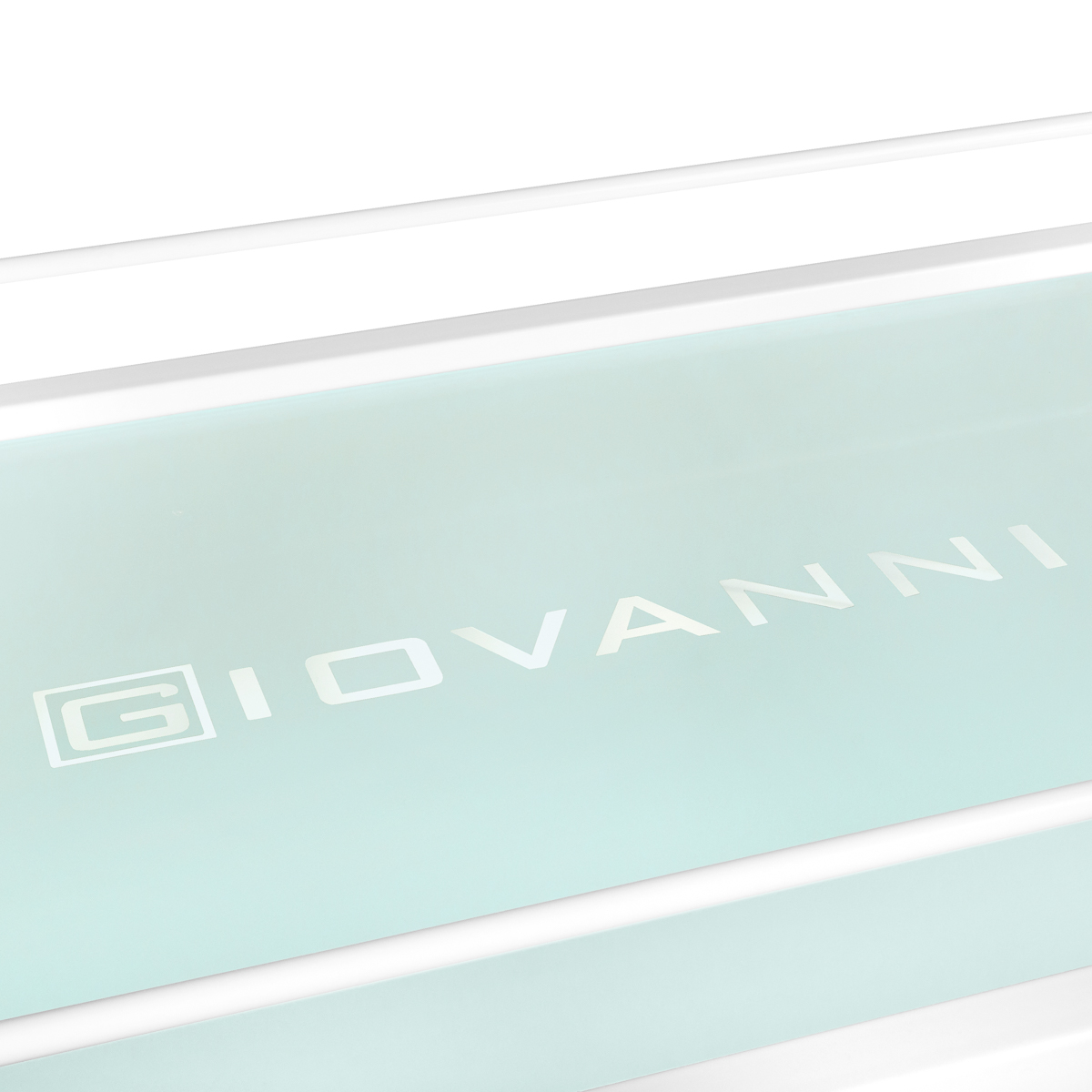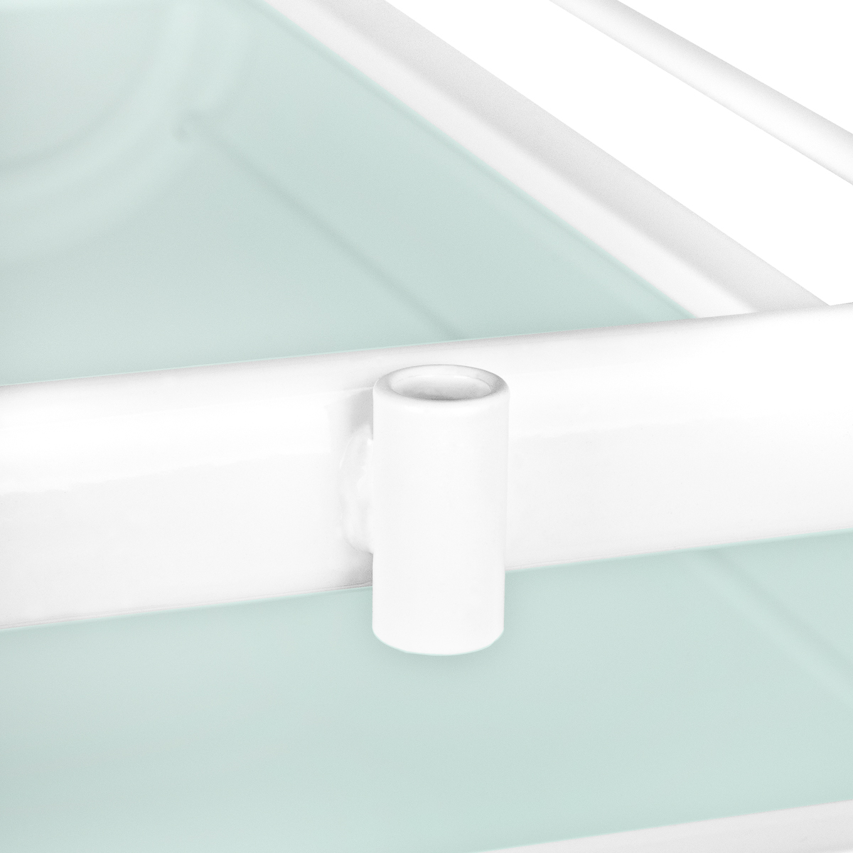aesthetic table for a cosmetic device, made of metal and glass, with wheels. has four glass shelves.