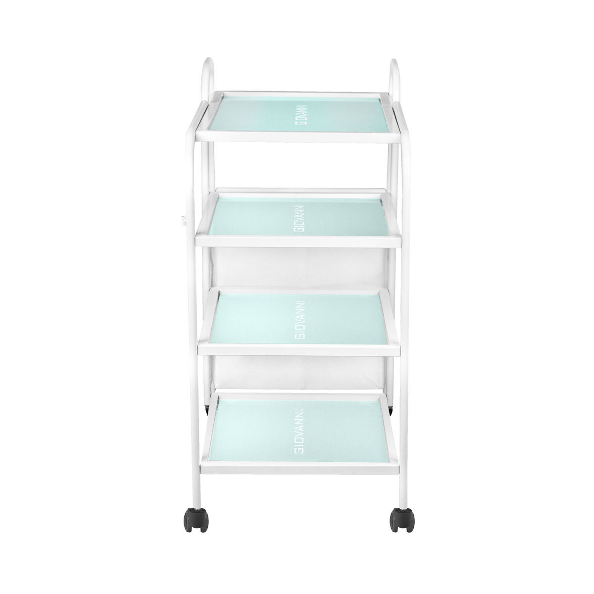 functional metal and glass table on rubber wheels. the table has four glass shelves with an engraved giovanni logo. an additional advantage of the table is a bag for dirty towels and cosmetic bands attached to it.
