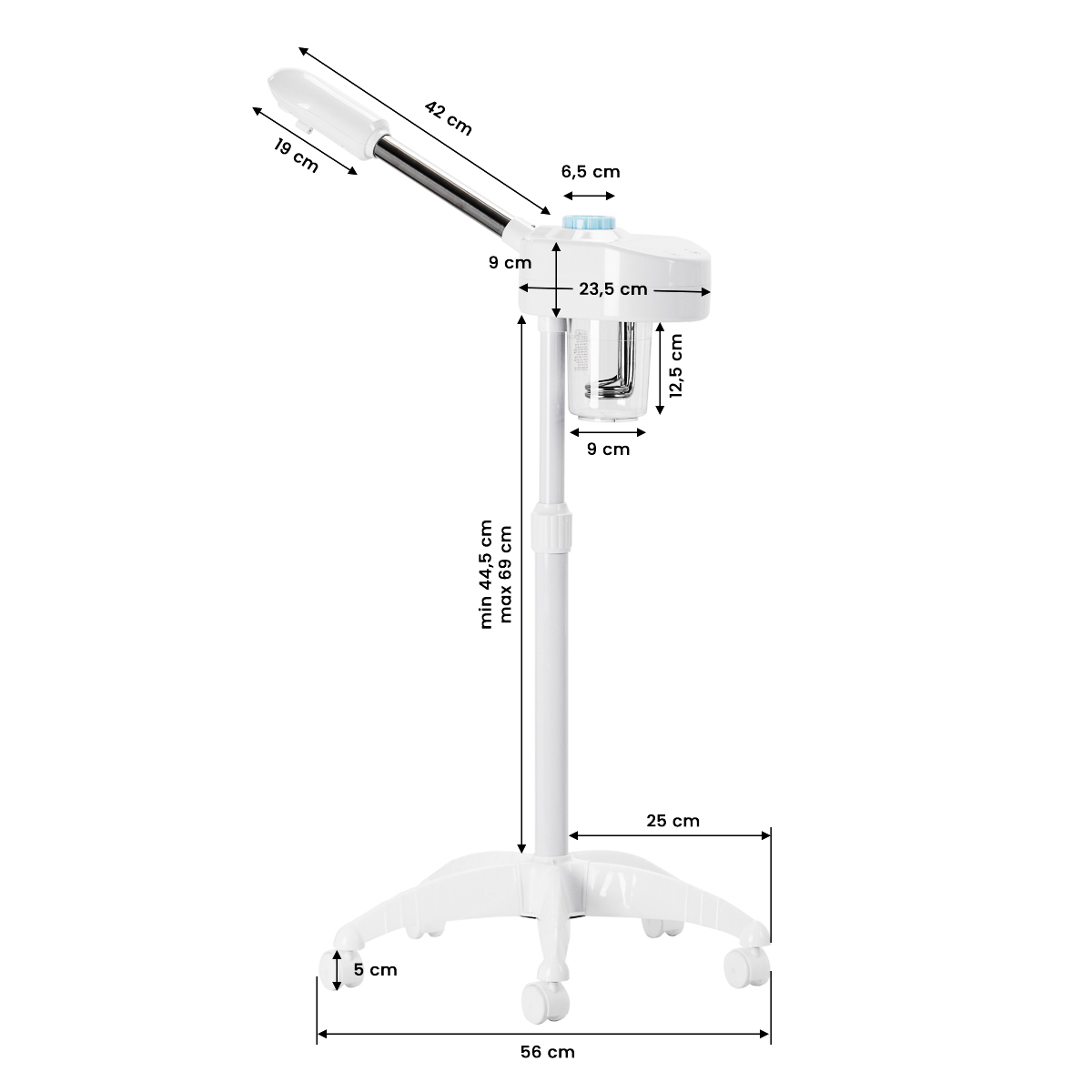 Minimalism and functionalityThe vapozon is made of durable plastic in shades of white, which makes the device easy to keep clean. The stand is equipped with a height adjustment in the range of 44,5-69 cm, which allows positioning the equipment at the right level to ensure comfort for the practitioner. The vapozon nozzle can be rotated, which increases the range of possible settings. The five-arm base with rubber wheels improves mobility, making it easier to freely move the device.