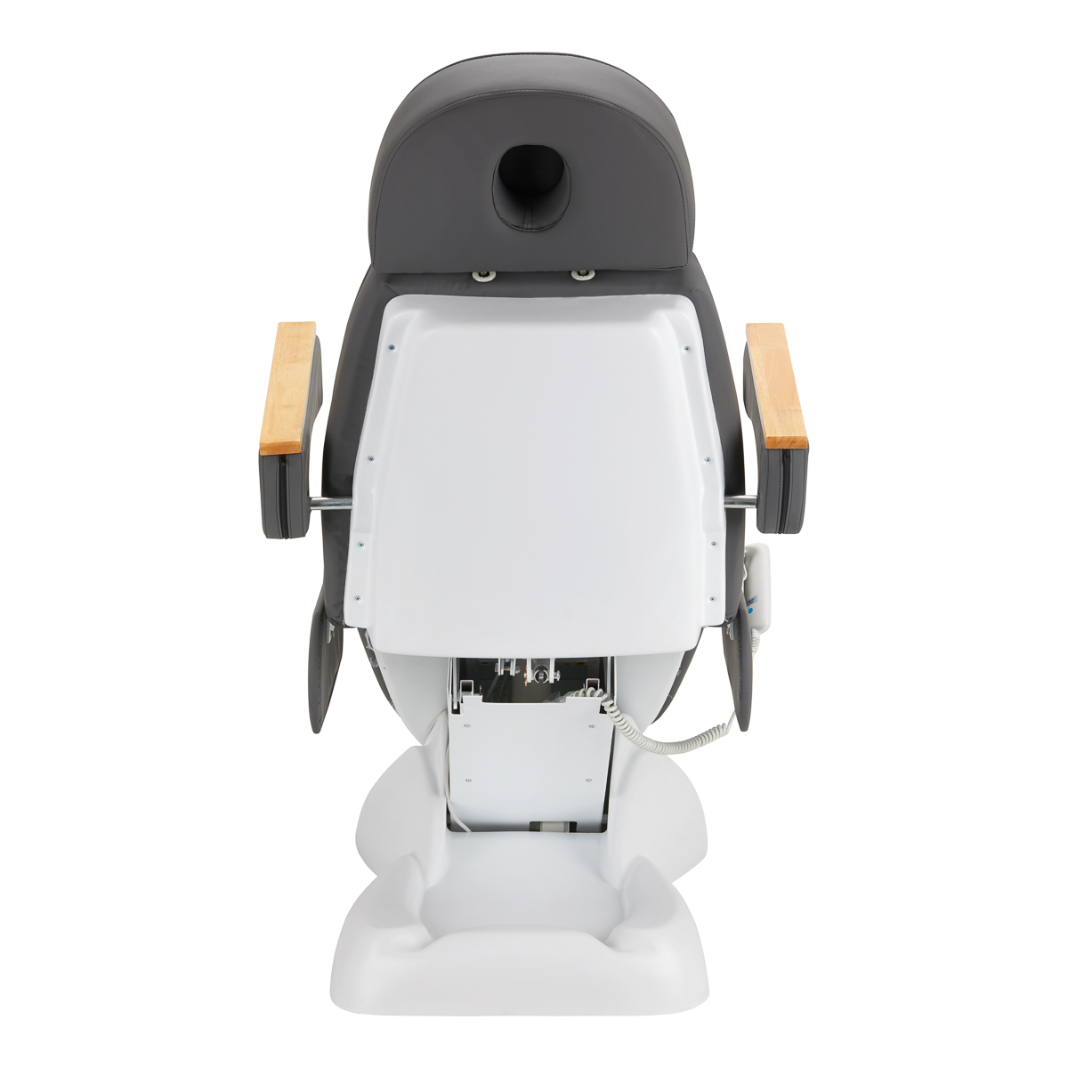 A classic, valued model of a cosmetic chairThe chair is filled with foam of appropriate hardness and covered with pleasant-to-the-touch imitation leather in shades of grey. Thanks to the use of a material that is easy to keep clean and resistant to selected disinfectants, the equipment is comfortable to use, resistant to moisture and easy to clean. A solid base made of durable material in shades of whiteensures stability during treatments. Decorative wooden elements on the armrests distinguish the chair from other models, being a visually appealing, elegant accent. Properly profiled hems give the chair a stylish look and make the seat ergonomic.