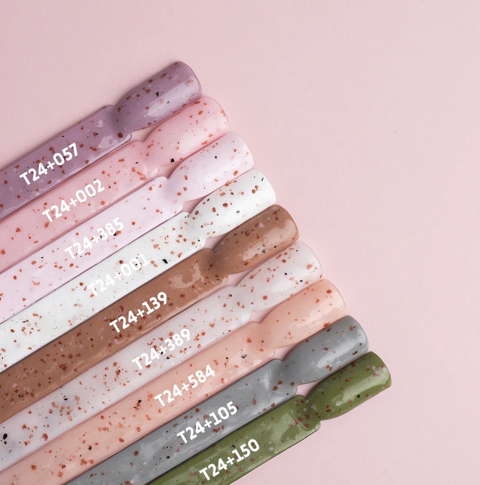 Transparent top coat with no dispersion layer, enriched with irregular particles in various shades of pink and brown.