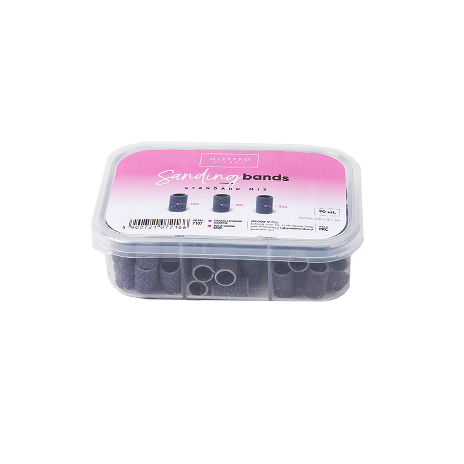 The abrasive bands box is an indispensable tool for every nail stylist, combining convenience, quality, and professionalism. The set includes 90 abrasive bands – 30 each of 3 grits (100, 180, 240), allowing you to easily adjust the abrasiveness level to your current styling needs. The bands are made of high-quality material – a ceramic coating with aluminum oxide, ensuring durability, precision, and safety.