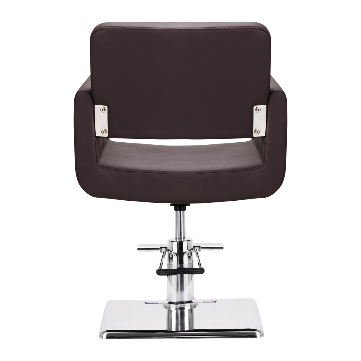 Impressive hairdressing chairThe solid, square base ensures stability during use, while its polished, smooth surface gives an elegant appearance. The seat filled with durable, deformation-resistant foam and upholstered with pleasant-to-touch synthetic leather is durable, resistant to moisture and easy to clean. The elegant brown emphasizes the timeless design, which harmoniously fits into both modern and traditional interiors of hairdressing salons.