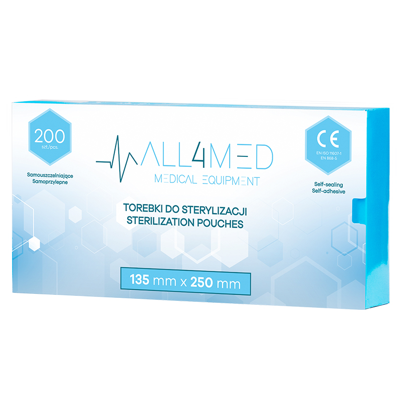 all4med high-quality self-adhesive foil and paper bags are made of materials that meet all the required medical standards. are equipped with a self-adhesive tape thanks to which there is no need to use a welding machine. the indicator placed on the product will confirm the correct sterilization process by changing its color. bags are designed for steam sterilization.