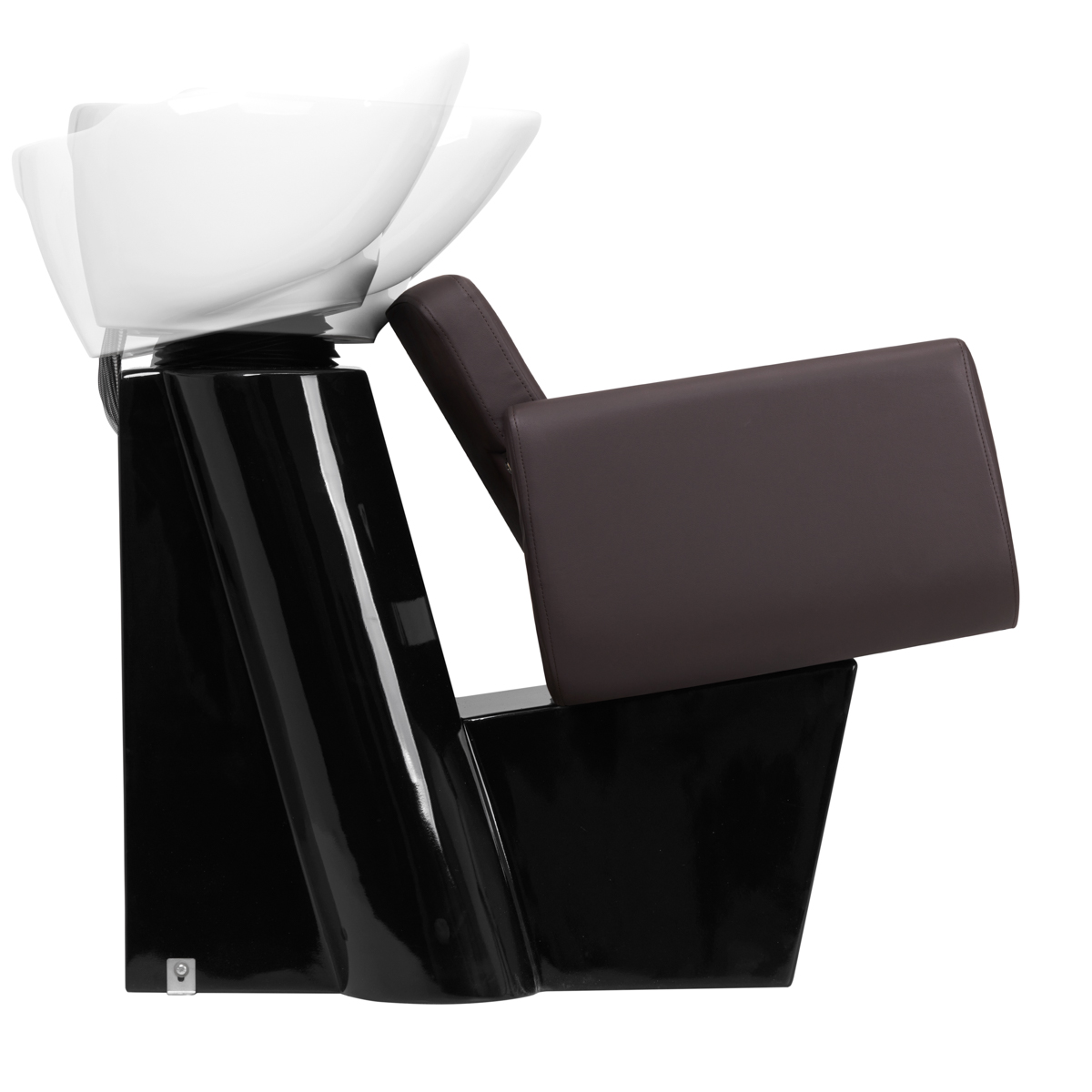 professional hairdressing washer - stable, extremely comfortable, solidly constructed. modern design makes it a beautiful complement to the equipment of a modern hairdressing salon. seat made of high-quality brown eco-leather. white myki bowl, with the possibility of adjusting its inclination. black, brown and white car wash.