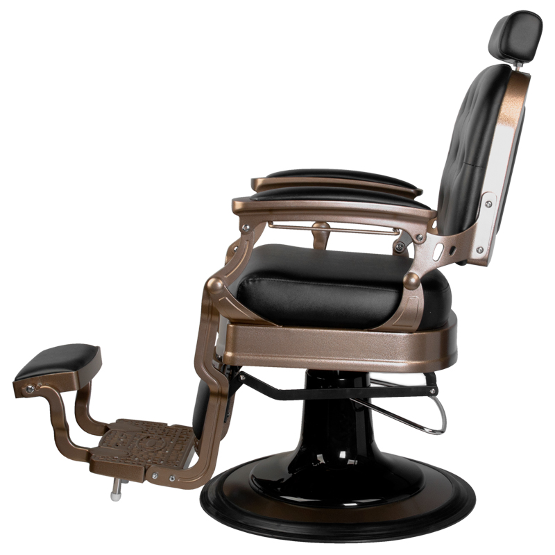 Sophisticated design with high functionalityThe solid construction of the base ensures stability and high comfort of use. The seat filled with durable, deformation-resistant foam and upholstered with pleasant-to-the-touch synthetic leather resistant to abrasion and easy to care for ensures long-term durability of the furniture and comfort at the highest level. The materials used make the chair resistant to moisture, durable and easy to clean. Stylish upholstery in shades of black, decorative quilting with buttons on the backrest and an elegant footrest give the chair a unique character. Its design, inspired by the vintage style, fits perfectly into the atmosphere of classic barber shops, emphasizing their unique atmosphere. The refined details, original texture of the upholstery and a massive base ensure not only aesthetics, but also maximum stability. This is a combination of elegance and functionality that will meet the expectations of even the most demanding professionals.