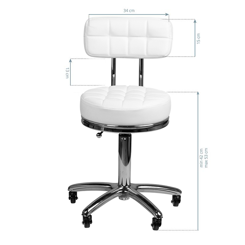 white cosmetic stool with a quilted seat and a comfortable backrest. it is height-adjustable and the arm-like base is equipped with solid metal-rubber wheels.