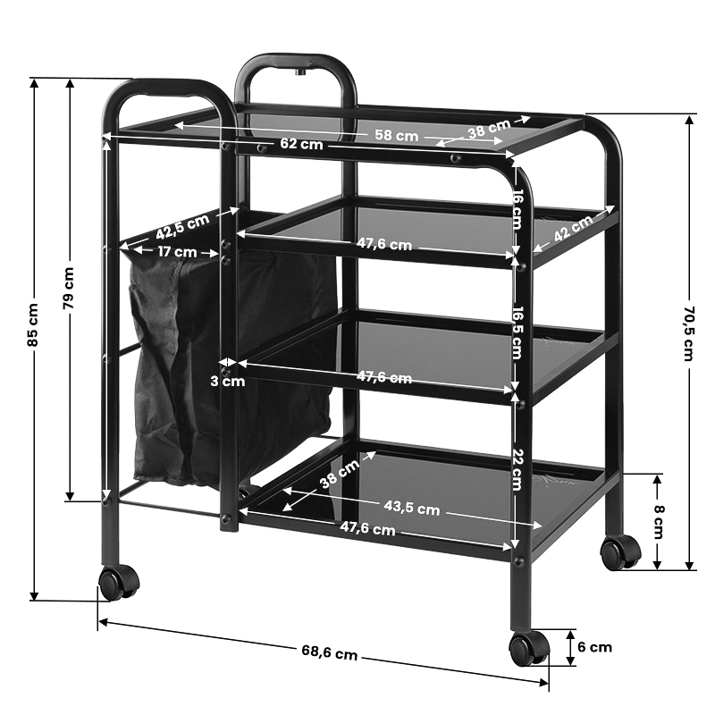 Assistant Pro Ink 1031 is a functional metal and glass assistant on rubber wheels, which has four glass shelves. an additional advantage is the attached bag for dirty towels and bands, etc. it has a lamp holder.