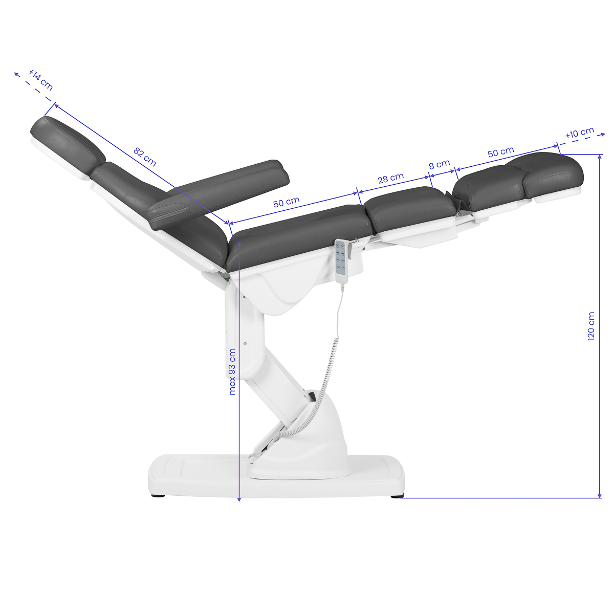 The specially designed footrest significantly facilitates pedicure and podiatry treatments. It is wide and stable, and its angle can be smoothly adjusted using an electric remote control. This solution allows for comfortable leg support and proper positioning, increasing the comfort of both the client and the person performing the treatment. The extendable footrest makes the chair perfectly suited to taller users, providing them with adequate support. The removable end of the footrest allows the practitioner to have full freedom of access to the feet and toes, providing greater comfort and precision during demanding treatments. With the seat raised to its maximum height, the footrest extended, and the cradle tilted, the height reaches approximately 120 cm, further facilitating precise work during specialist podiatry procedures.
