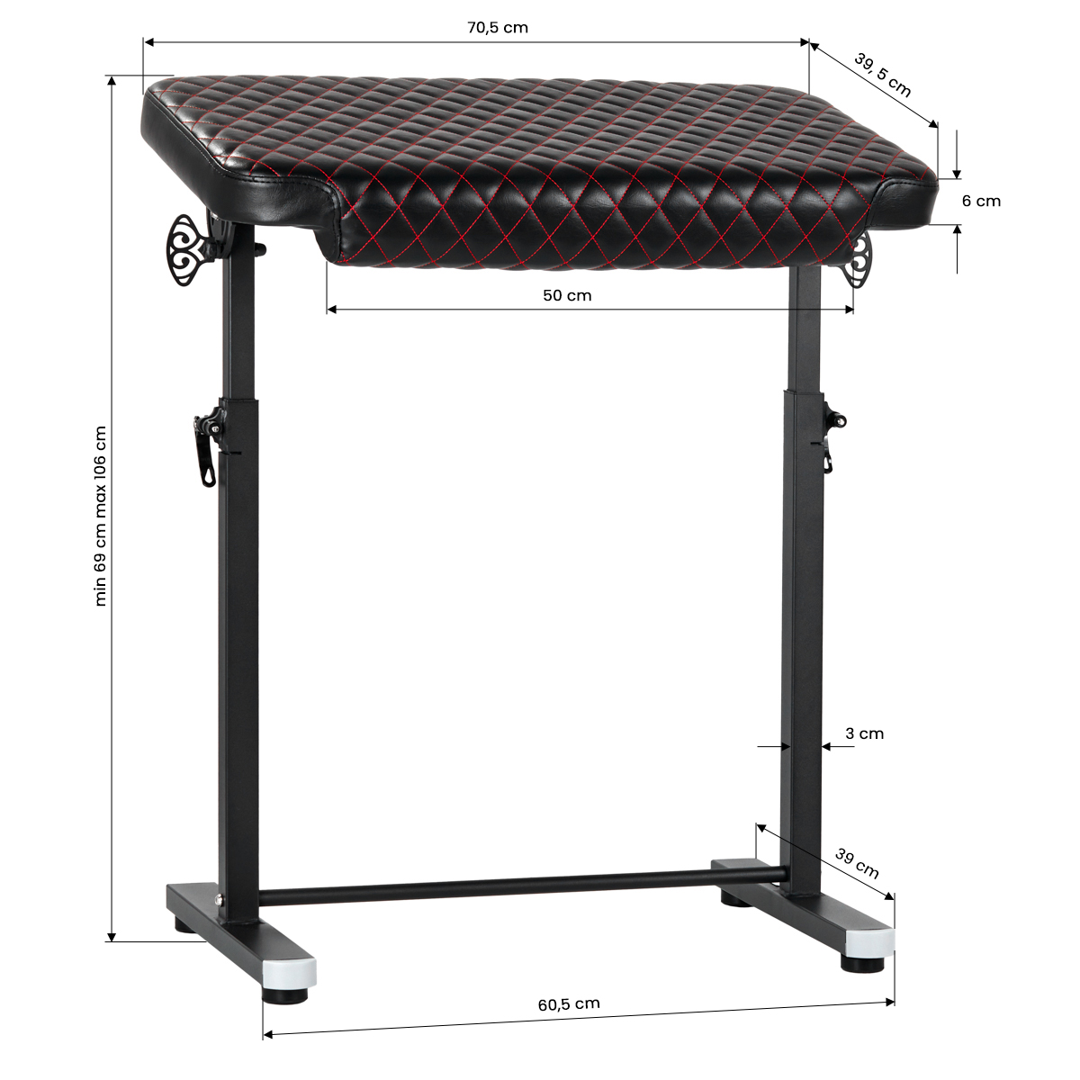 Adjustment to individual needsThe armrest height is adjustable within the range of 69-106 cm, which allows it to be adapted to different clients and guarantees optimal support during the tattoo session. Thanks to the tilt adjustment function, you can adjust the armrest’s positioning to the individual needs of the client and the characteristics of the procedure, providing even more comfort during tattooing.