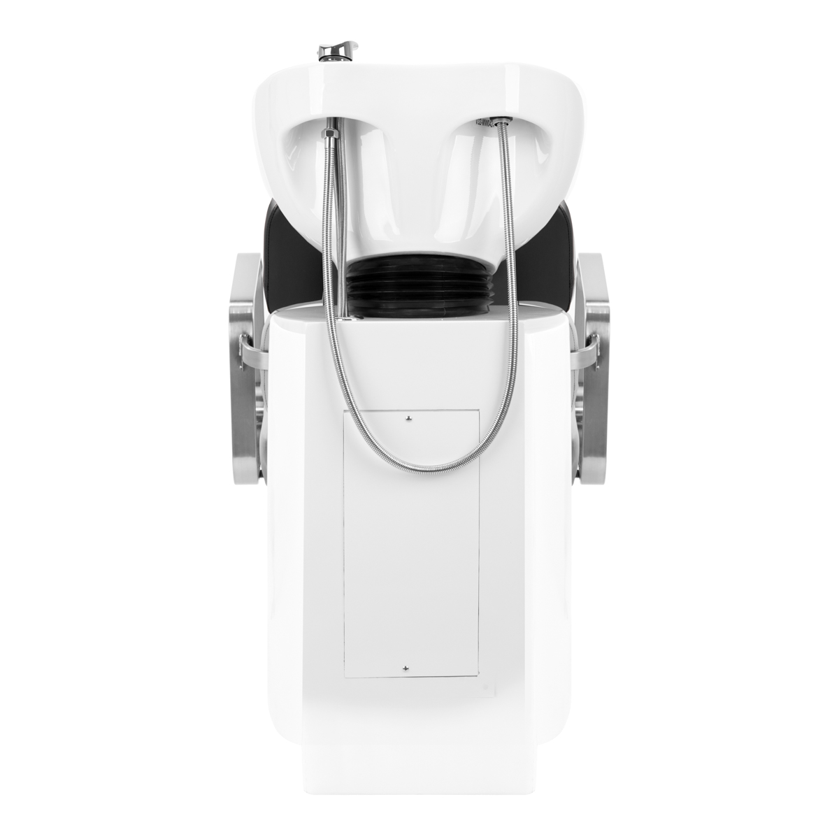 Amenities for convenience of useThe practical hair wash unit is equipped with a mixer faucet, which provides easy access to hot and cold water. This makes it easier to adjust the temperature to the customer's individual preferences. A dedicated place to hang up the handset makes work easier, and the chrome-plated plug with a special strainer allows you to control the water flow and maintain high hygiene standards in the salon. The water connection has been placed inside the base, allowing the pipes to be easily hidden. A significant advantage of this model is the opening left between the backrest and the seat, which makes it easier to keep the living room clean by allowing you to easily sweep dirt from every nook and cranny of the chair. The hair wash unit has been designed in such a way as to ensure comfort during various treatments, ensuring proper back support. The combination of functionality and amenities makes working in a hairdressing salon even more comfortable.