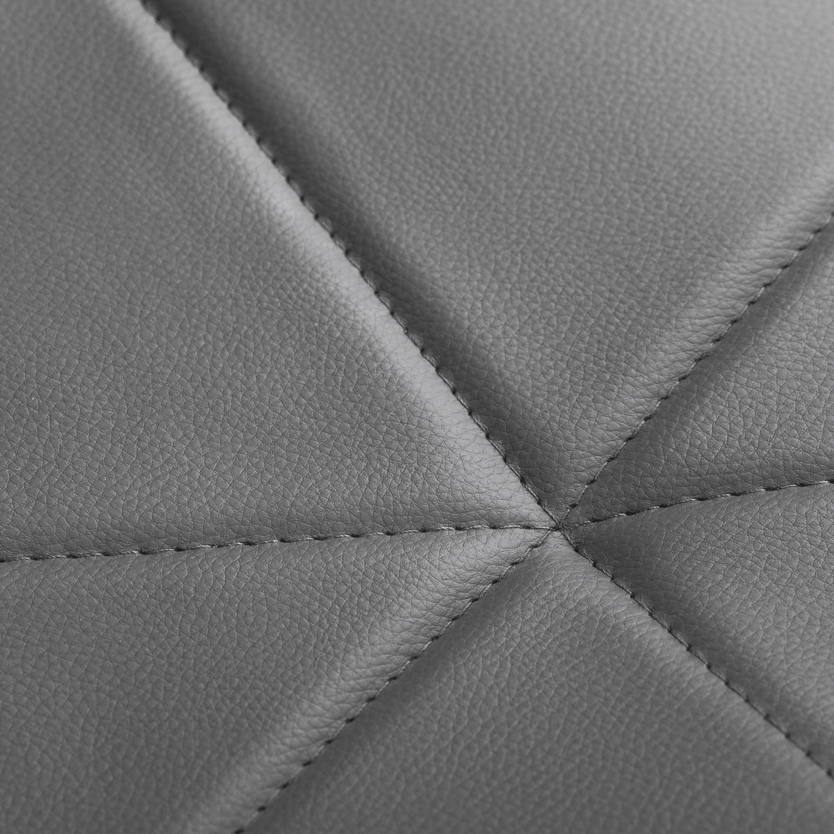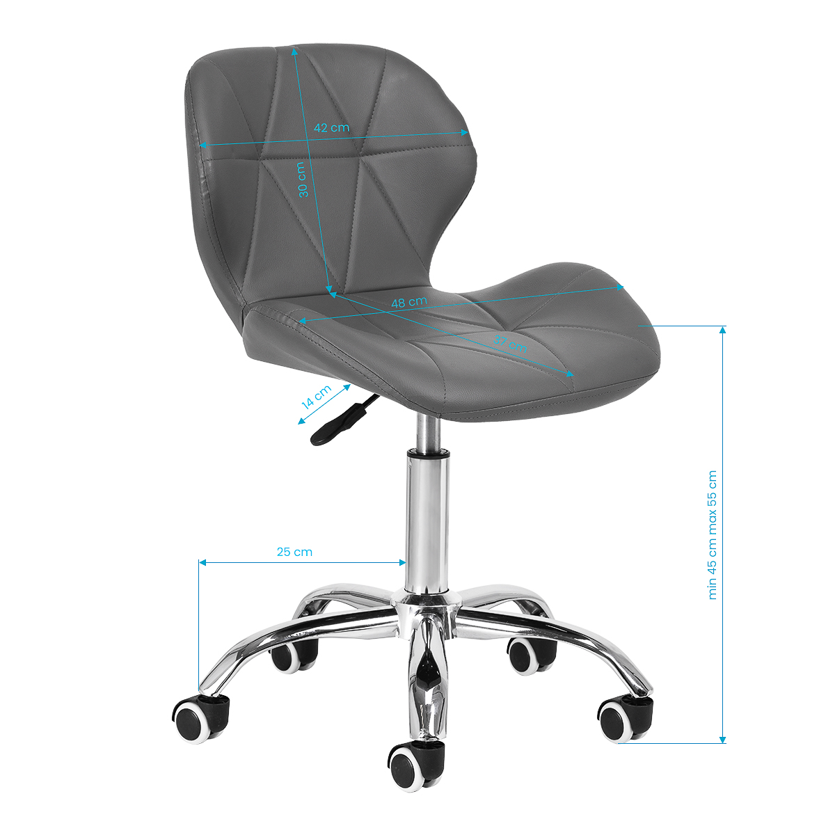 Simplicity and functionalityThe five-star base in chrome shades is equipped with rubberized wheels, providing considerable mobility and allowing the furniture to move freely around the workplace. The seat is upholstered with pleasant-to-touch faux leather in an elegant shade of gray. The material guarantees durability, resistance to moisture, and ease of cleaning. The design is complemented by stylish stitching, emphasizing the modern look.