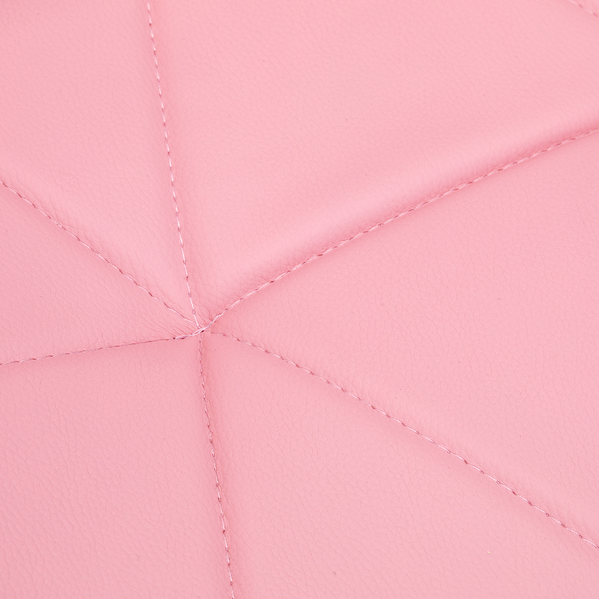 Simplicity and functionalityThe five-star base in gold shades is equipped with plastic wheels, providing considerable mobility and allowing the furniture to move freely around the workplace. The seat is upholstered with pleasant-to-touch faux leather in an elegant shade of pink. The material guarantees durability, resistance to moisture, and ease of cleaning. The design is complemented by stylish stitching, emphasizing the modern look.