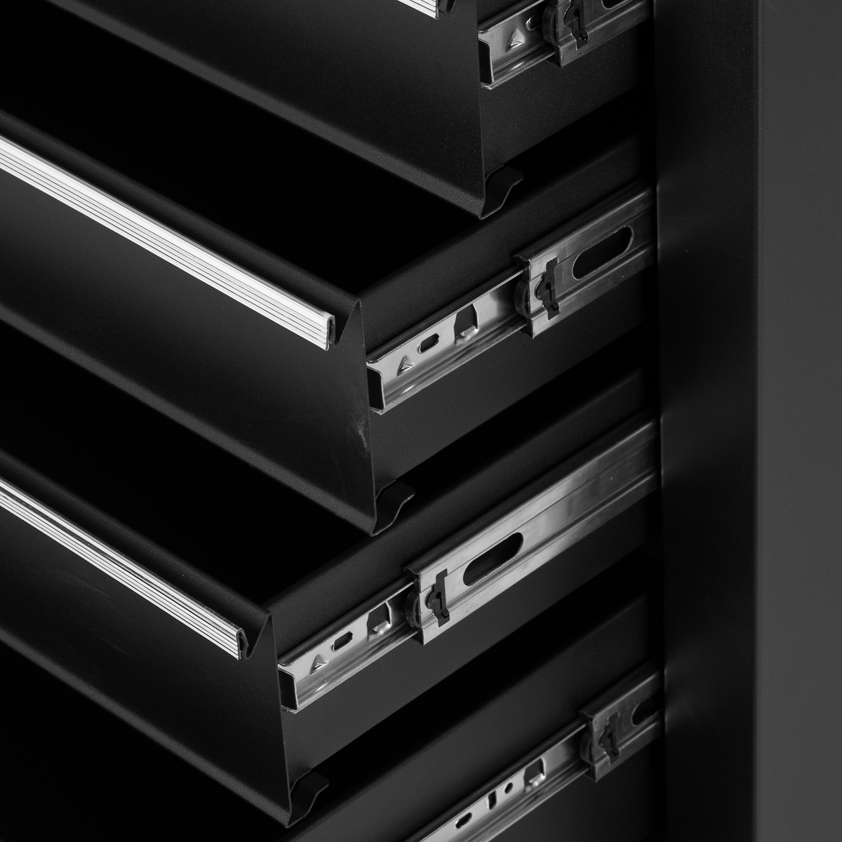 Five drawers with anti-slip matsThe model is equipped with five capacious drawers finished with anti-slip mats, and there is an additional shelf with an anti-slip mat on top. They provide secure storage for tools, inks and disposable accessories without the risk of shifting when opening or moving the helper, promoting tidiness and efficient organisation of work.
