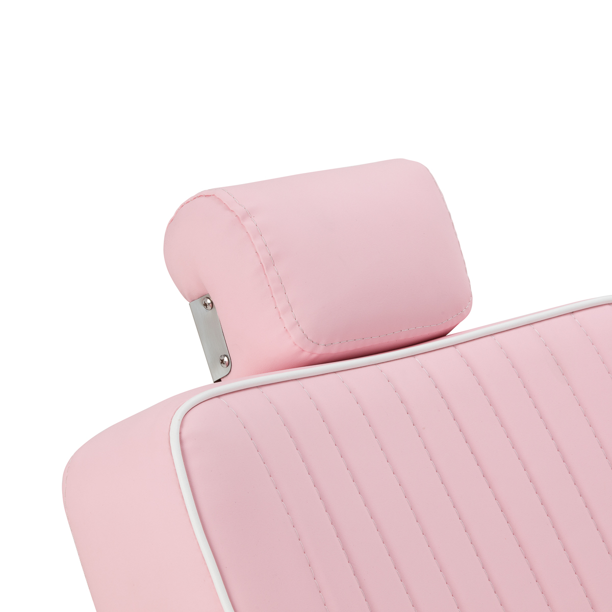 Sturdy base construction ensures stability and high comfort. The seat is filled with deformation-resistant foam and upholstered with soft, matt synthetic leather, combining durability with comfort. The materials used for the finish are moisture-resistant, durable and easy to clean, making the chair perfect for everyday use. Stylish stitching and upholstery in shades of pink give it a unique character, blending perfectly with the décor of modern barbershops.