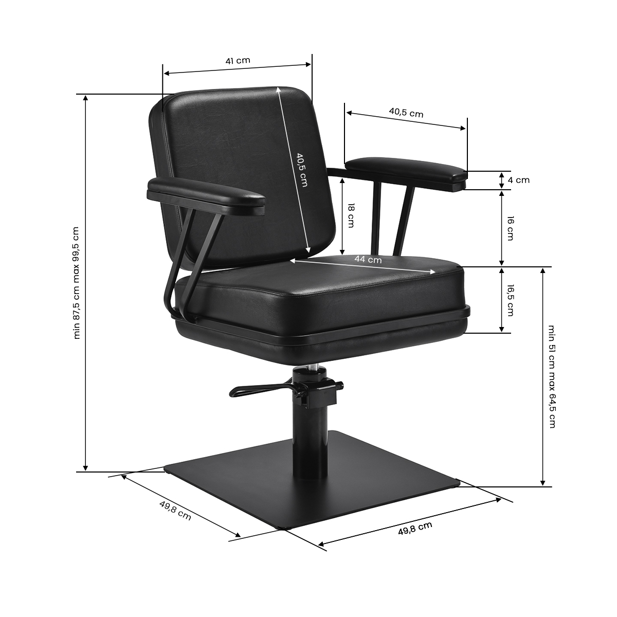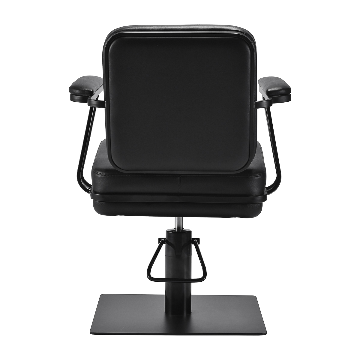 The profiled chair provides lumbar support and high comfort of use, while the upholstered armrests allow for the correct positioning of the client's shoulders. The stable, square base in matte black emphasises the stylish look, and the pleasant-to-touch synthetic leather in shades of black guarantees comfort during long treatments, durability, moisture resistance and ease of cleaning. The modern design gives the interior a unique character, and the chair works well in both modern and classic arrangements, emphasising the professional image of the salon.