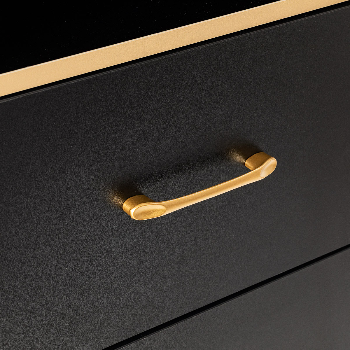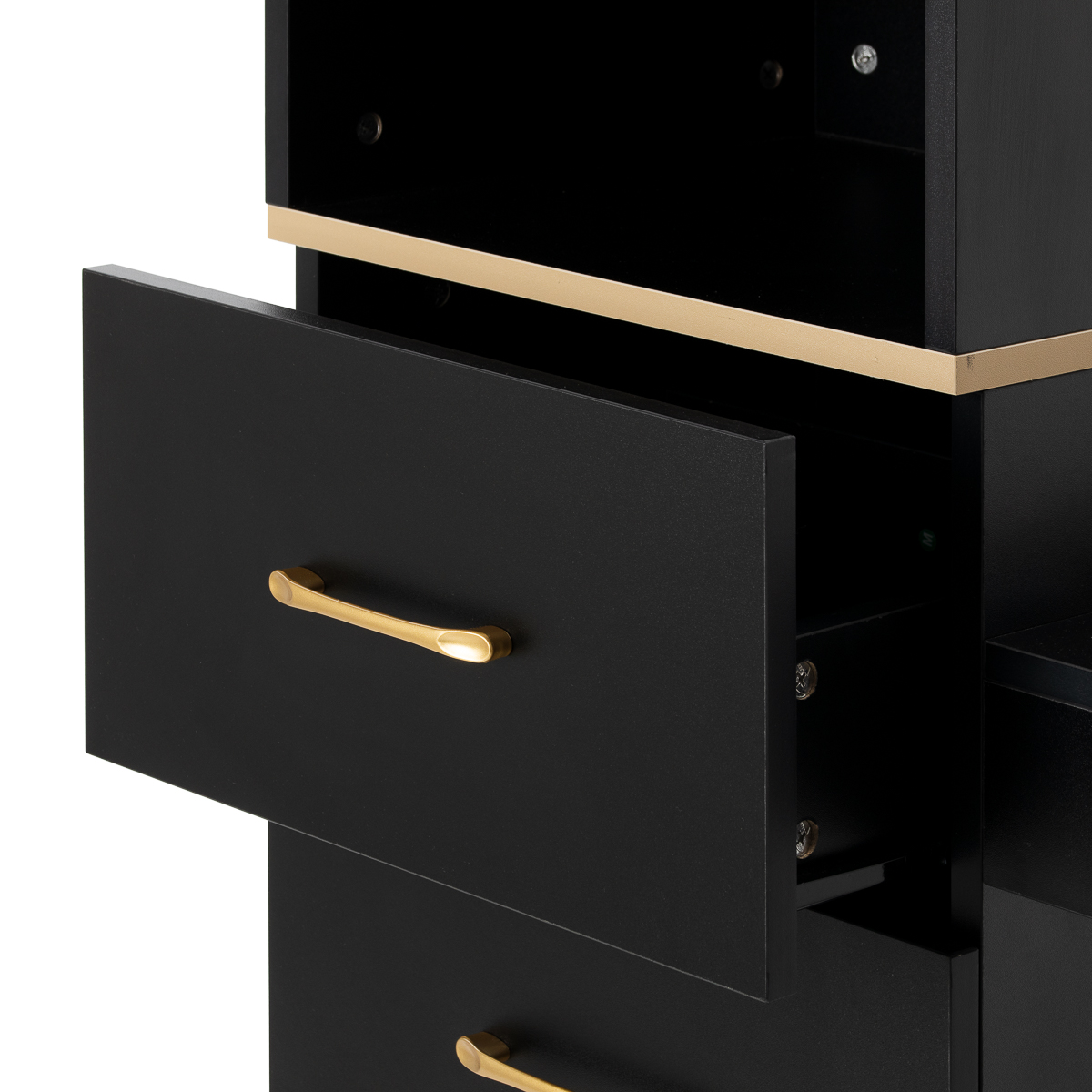 A combination of design and functionalityThe sturdy construction ensures stability, whilst the smooth surfaces make it easy to keep the unit clean. The classic colour scheme gives the cabinet a timeless character that will fit perfectly into both minimalist and more distinctive interiors. The gold handles not only emphasise the elegant design but also ensure that each cabinet and drawer opens smoothly. The whole unit is a practical solution for a hairdressing salon, where order, ergonomic working conditions and a consistent aesthetic are essential.