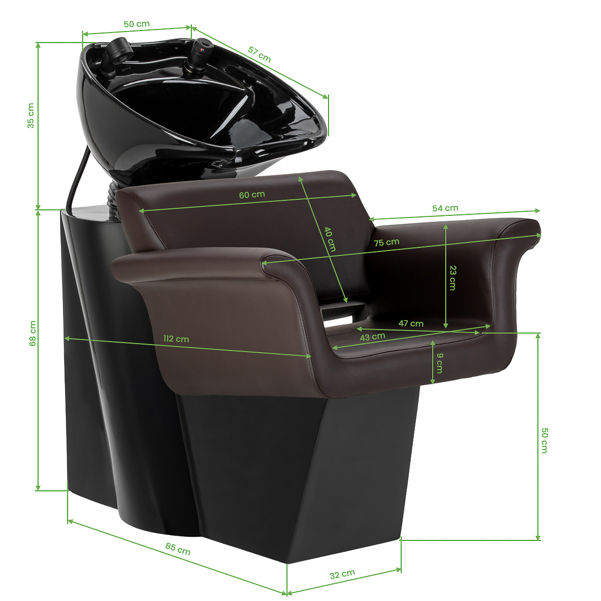 Minimalist elegance and comfortThe chair combines a modern, minimalist form with a high level of comfort. The characteristically outward-curving armrests lend it an elegant character, whilst supporting a comfortable and natural position for the client. The backrest, with its optimal angle of inclination, promotes correct posture and relaxation during treatments. The use of durable, moisture-resistant materials makes it easy to maintain and ensures the furniture retains its aesthetic appeal for a long time. A complete set of fittings – tap, shower head and dedicated hoses – ensures the unit is fully ready for use. The universal design means the model fits perfectly into both modern and classic interiors, emphasising the professional character of the salon.