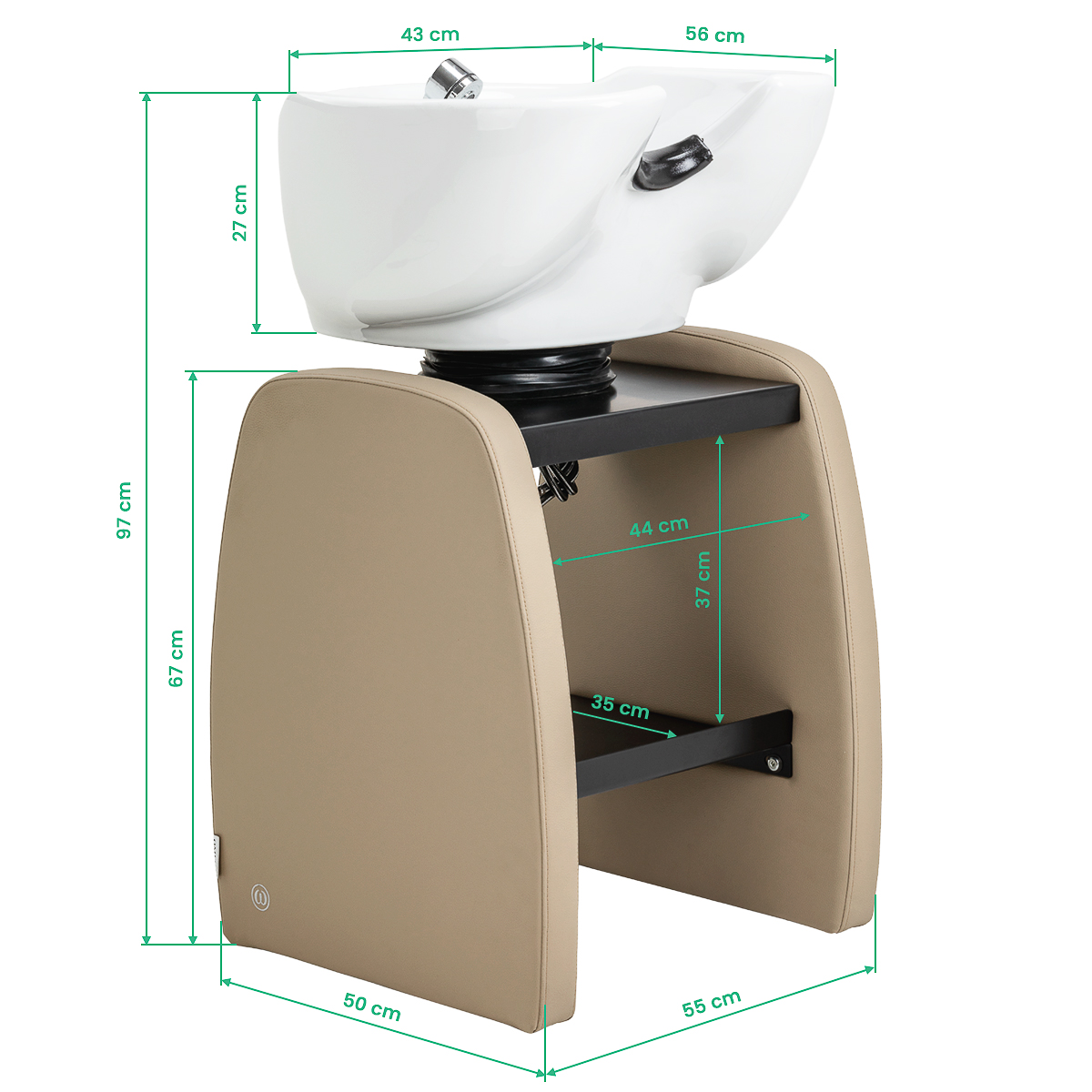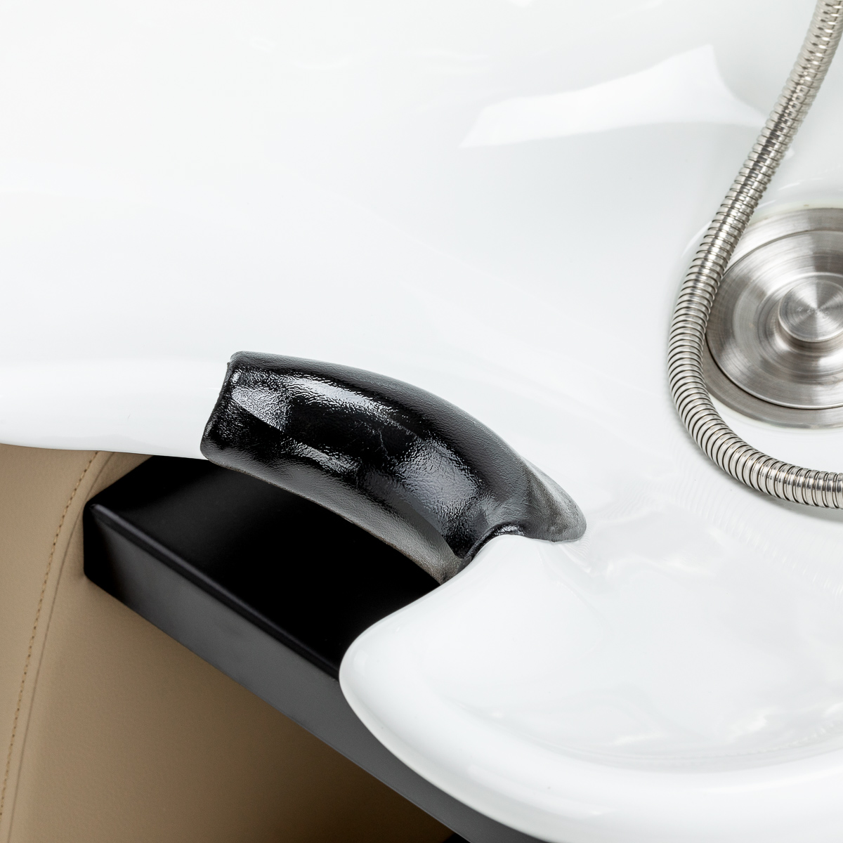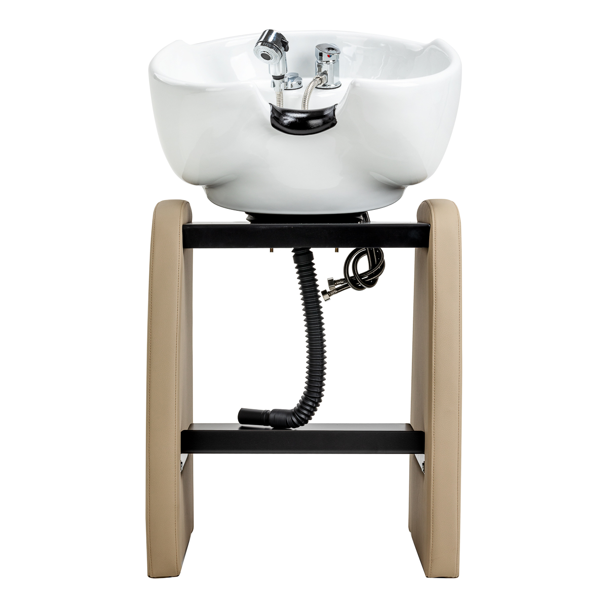 Aesthetic and stable designThe slightly rounded shape of the base gives the hairdressing wash unit an elegant look and a sense of visual lightness, emphasising the professional character of the station. The stable construction ensures comfort and durability during intensive use in a hairdressing salon. The minimalist design and elegant colour scheme make it easy to integrate the wash unit into modern interior designs, supporting a cohesive and aesthetic salon image. The complete set of fittings – tap, shower head and dedicated hoses – provides a full range of tools for the job.