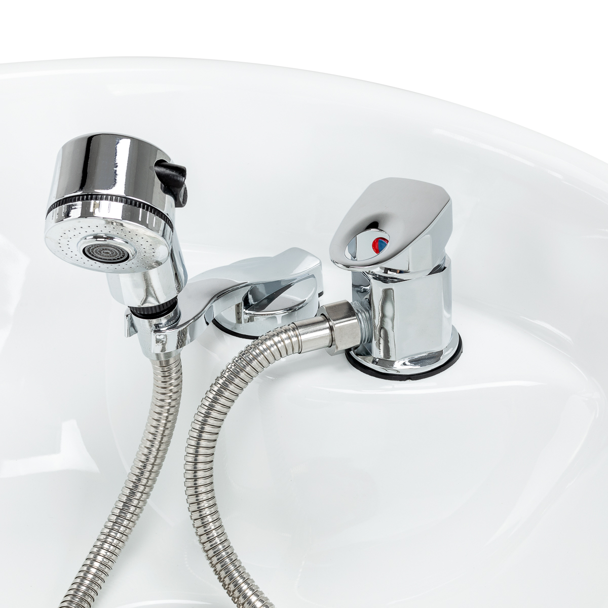 Well-thought-out features to support daily workThe model is fitted with a mixer tap, which allows for quick adjustment of the water temperature and ensures comfort during treatments. A dedicated space for storing the shower head helps keep the workspace tidy , while a plug with a built-in strainer allows you to control the water flow and reduces the build-up of debris. A practical shelf beneath the basin provides easy access to cosmetics and accessories, which improves the organisation of the workstation and facilitates daily work in the salon.