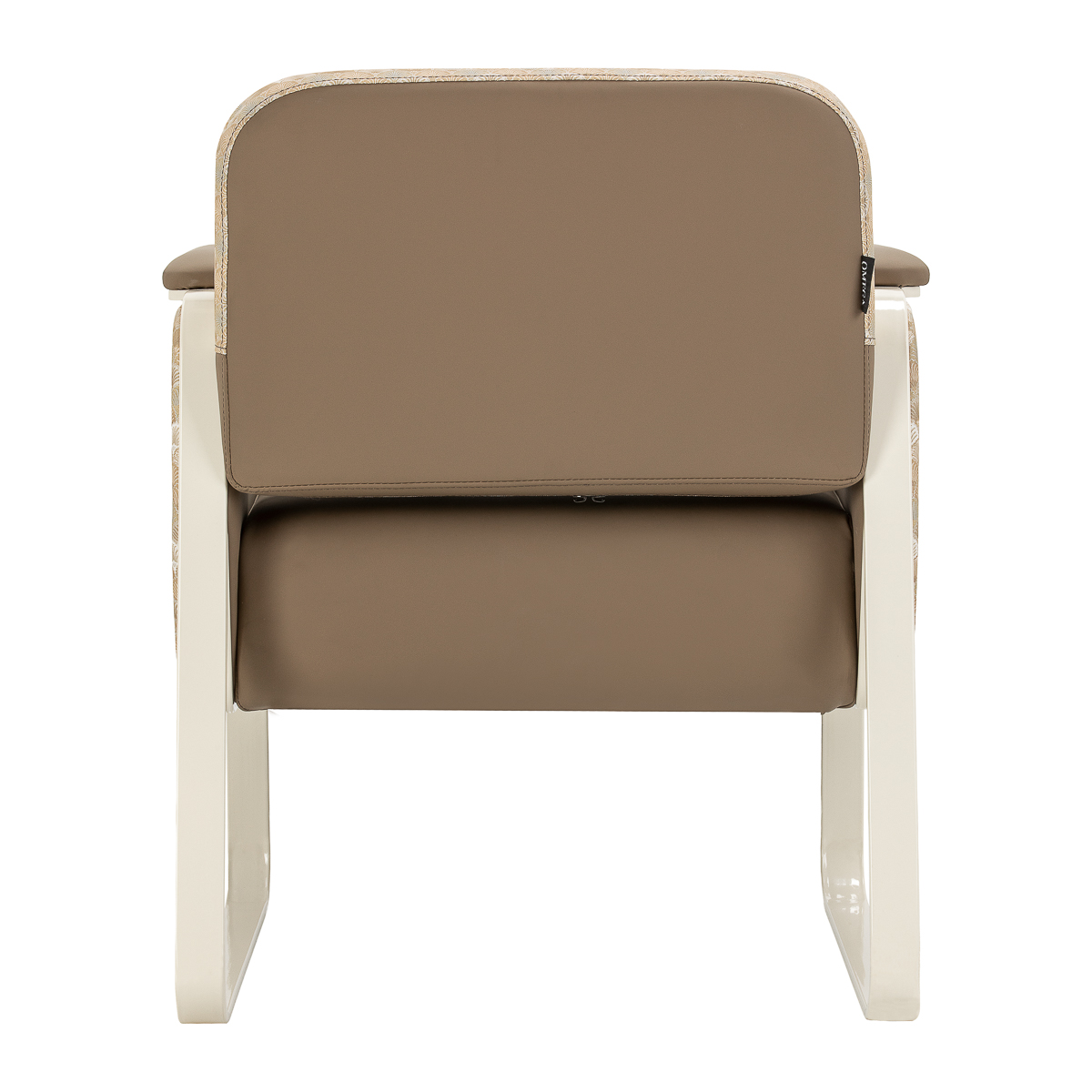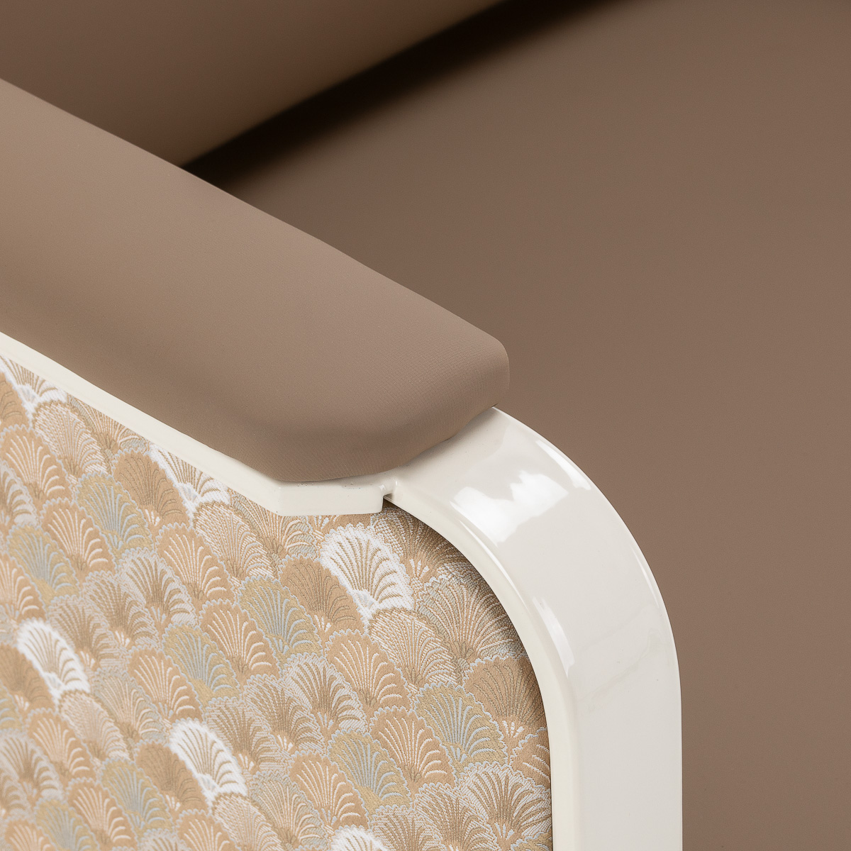 Functionality and comfortThe chair is made of durable synthetic leather in an elegant light brown colour. The upholstery material is distinguished by its resistance to moisture and ease of cleaning, ensuring the furniture retains its aesthetic appearance for a long time. The sturdy metal frame in a light shade perfectly complements the upholstery colour scheme. The decorative pattern on the outer section, inspired by Art Deco, gives the furniture a unique character and attracts attention, emphasising the style of the interior.